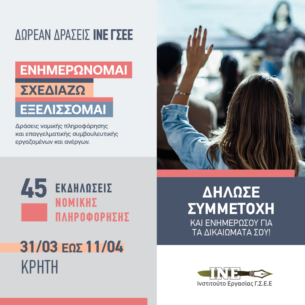 ℹΔες το πρόγραμμα και δήλωσε συμμετοχή ή κλείσε ραντεβού με τους νομικούς συνεργάτες του ΙΝΕ ΓΣΕΕ.